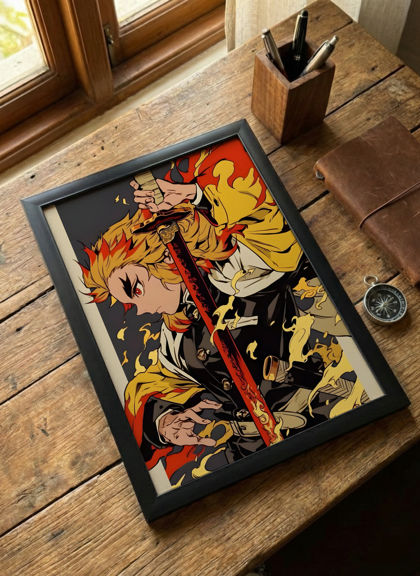 Rengoku Kyojuro Poster Demon Slayer Wall Art! Upgrade your room decor with this high-quality Rengoku Kuojuro poster from the hit anime Demon Slayer.